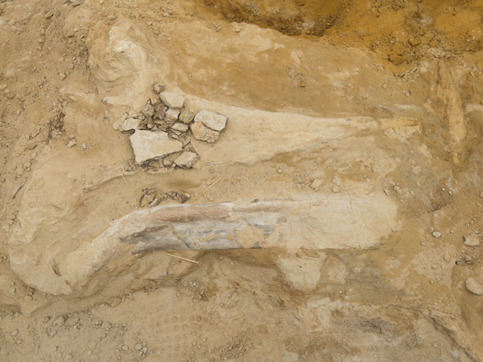 The discovery of a partial horned dinosaur in late August 2017 at a construction site for a new public facility in Thornton, Colorado (now named the Fossil Ridge Public Safety Center) led to the excavation of the most complete Torosaurus specimen ever found, nicknamed “Tiny.” Torosaurus, a rare cousin of Triceratops, is known for its larger, thinner frill with open fenestrae (windows). In addition to a complete, disarticulated skull, approximately one quarter of the skeleton was recovered, including ribs, limb bones, and part of the pelvis.