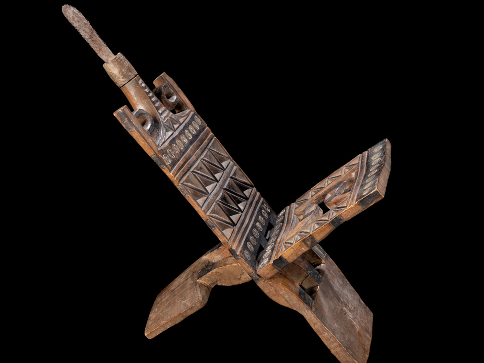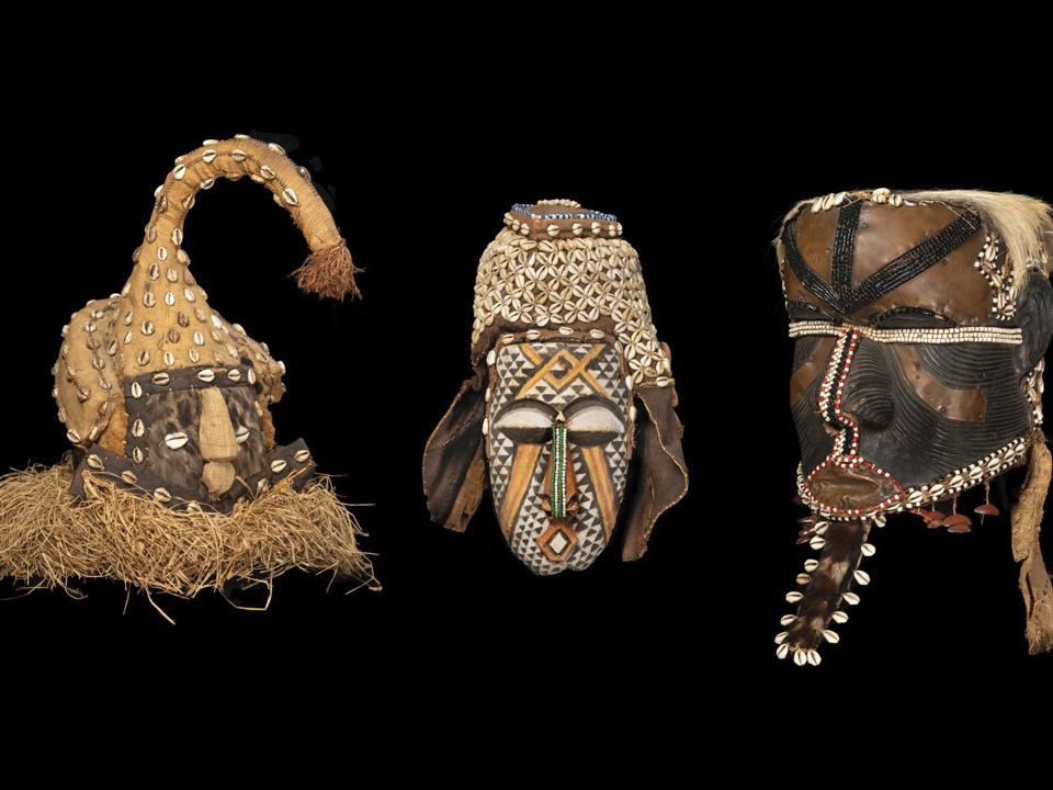 Staff re-discovered an important collection of Kuba masks, including beautiful examples of three royal Kuba masks, known as mwaashmboy , ngaady a mwaash , and bwoom masks. Often interpreted as representing three siblings, these masks tell the Kuba kingdom’s creation in the central Democratic Republic of the Congo, and were usually performed during initiation ceremonies for young men. The mwaashmboy represents the son of the god who came to earth to start the kingdom; the ngaady a mwaash represents his sister (and wife), who is the epitome of femininity and motherhood. The lines curving down from the ngaady a mwaash eyes indicated she is crying tears of joy and pain that symbolize womanhood. Their brother, bwoom, creates conflict by trying to win his sister’s love and overthrow his brother. These three Kuba masks are beautifully decorative, excellent examples of Central African artistry.