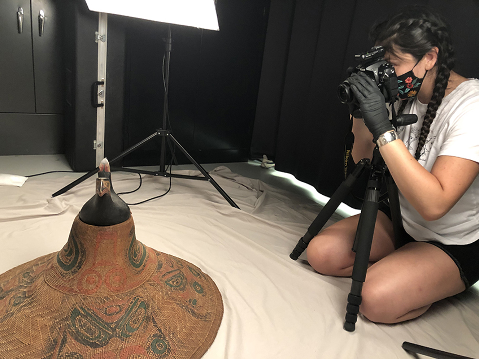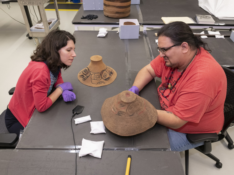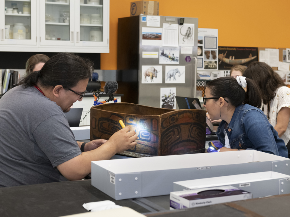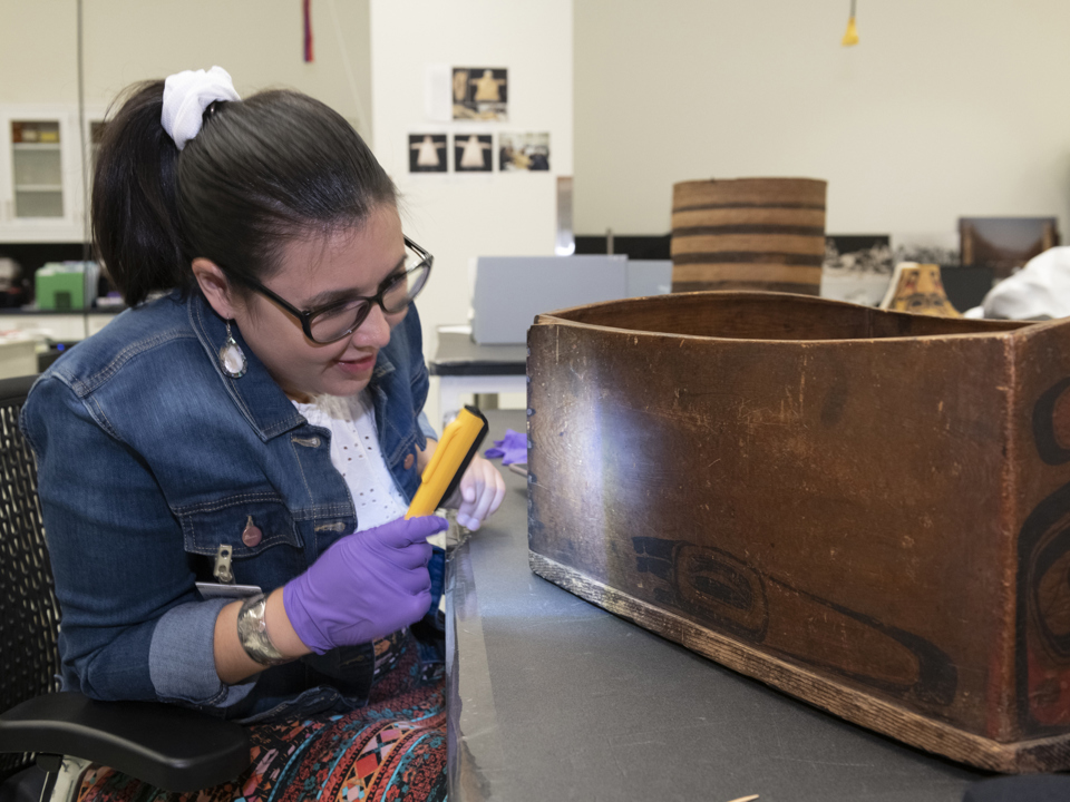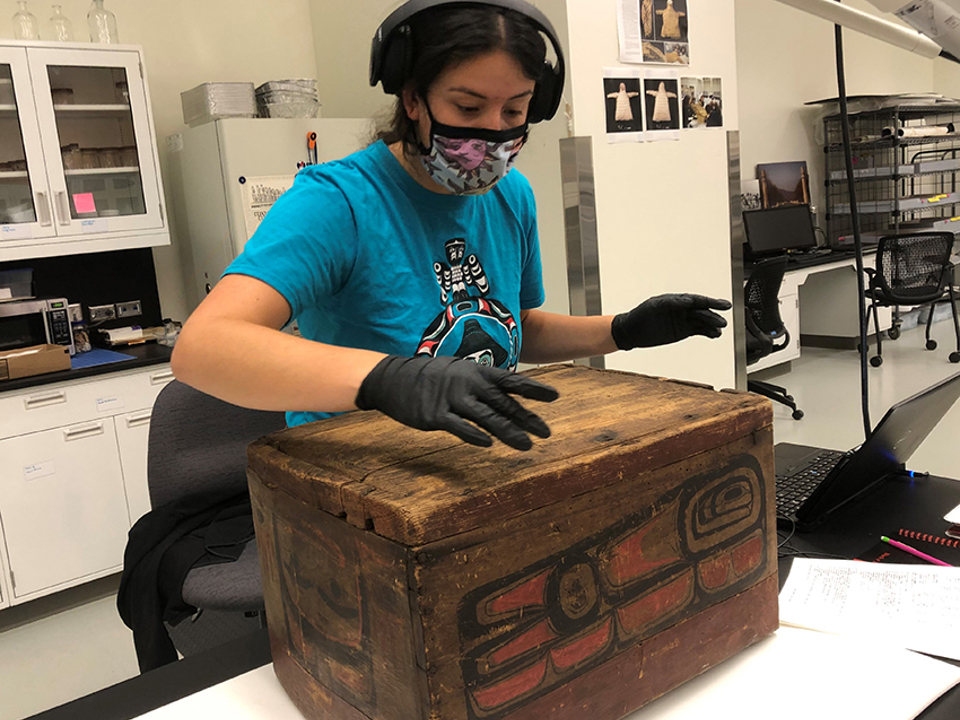 The first workshop took place in August 2021 with representatives from Haida Gwaii. During the summer of 2021, we welcomed Marlo Wylie Brillon (Skidegate Haida and Northern Cree) as our Native American Science Intern. In addition to participating in the grant workflow, Marlo conducted cultural research and outreach to Northwest Coast communities to help us better describe and care for these items. Marlo contributed corrections to our catalog information based on her own cultural knowledge and what she learned from reaching out to other knowledge keepers. Through this outreach, Marlo arranged for two Haida representatives to come to the Museum. An emerging artist, Marlo was also able to share observations on materials and techniques used in carved wooden pieces from her own art practice.