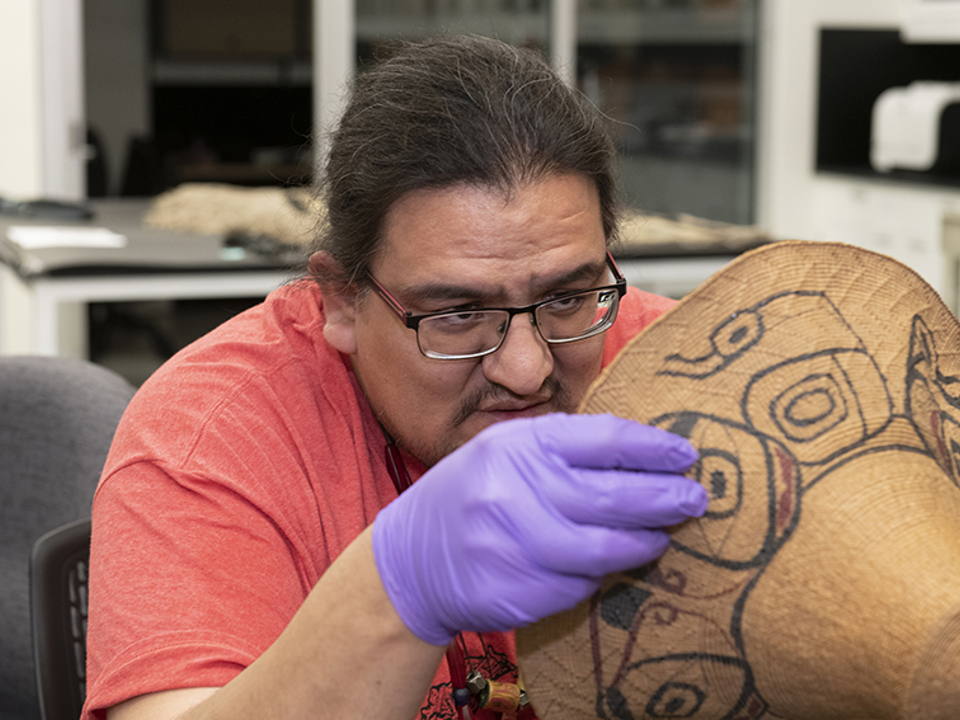 In November 2021, two Tlingit representatives–Gooch Shaayí Harold Jacobs and Naakil.aan Hans Chester–visited from Southeast Alaska. The three-day consultation included discussing appropriate conservation and collections care for Tlingit items. Harold Jacobs, Cultural Resource Specialist for the Central Council of the Tlingit and Haida Indian Tribes of Alaska, has decades of experience working with cultural material, museums, and repatriation efforts. Hans Chester is a Tlingit language and culture teacher, basket weaver, and beader. Harold and Hans shared cultural knowledge regarding the items and made observations on materials, production technology, and style. Both Harold and Hans had visited collections at the Museum before, but this visit was the first focused on materials, techniques, and preservation of Tlingit items. Harold and Hans returned to the Museum in March 2022 to delve deeper into conservation questions about certain items. Hands-on demonstrations of basketry repair techniques-both traditional and conservation-were a highlight of this visit.