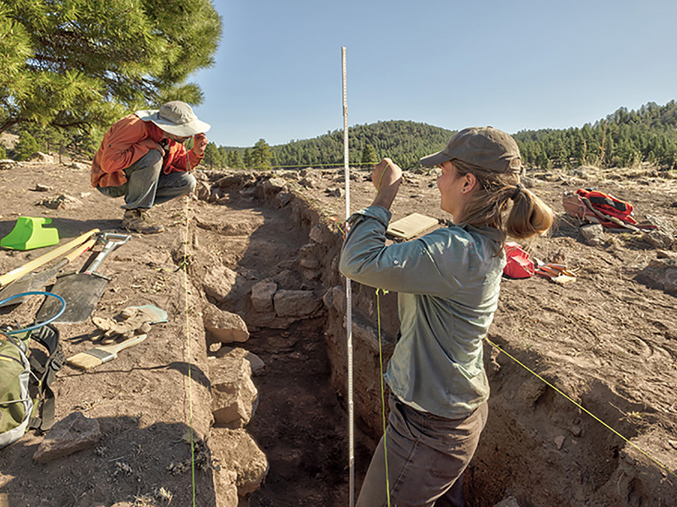 Thus far, we have examined several survey tracts in a range of environmental settings—from pinyon and juniper scrublands to ponderosa pine forests. We have covered over 3,000 acres and documented 44 archaeological sites—including several previously (and often poorly) recorded sites. Although we have recorded pithouse sites, the majority of the sites we identified are masonry pueblos associated with black-on-white pottery from the Reserve (1000–1100 CE) and Tularosa (1100–1250 CE) phases. We have also noted a handful of previously unrecorded rectangular great kivas, which led to our excavation of the Torriette Lakes Great Kiva and the quest to understand the community that used this space.
